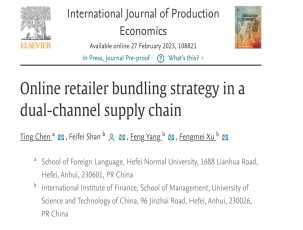 商务英语系陈婷副教授以太阳成集团122ccvip第一作者身份,在运营管理国际权威期刊《International Journal of Production Economics》发表论文“Online retailer bundling strategy in a dual-channel supply chain”。该期刊是中科院与JCR一区期刊,也是SCI与SSCI共同收录的高质量期刊。这是陈婷老师在主持国家自科基金青年项目期间,与中国科学技术大学管理公司杨锋教授团队合作取得的研究成果。此外,陈婷老师曾先后在IJPR和JORS等国际主流运营管理期刊发表多篇研究论文。