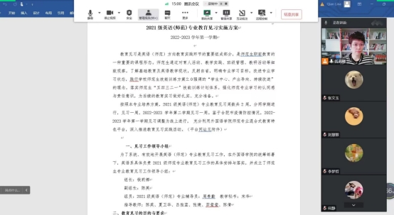 会议伊始,钱莉娜向同学们介绍了本次线上教育见习的流程,教育见习工作的领导小组成员以及教育见习的目的与要求。另外,钱莉娜为同学们详细解读了《英语专业人才培养方案》中关于教育见习的内容并强调其重要性。钱莉娜强调,在见习过程中要关注老师的教学方法,课堂提问及反馈情况,优质的线上学习平台可以给员工们提供丰富的资源,同学们可以向更多优秀的老师学习,取百家之长。陈英老师向同学们全面展示了线上教育见习资源,并给同学们解读了教育见习手册以及如何按要求完成手册。