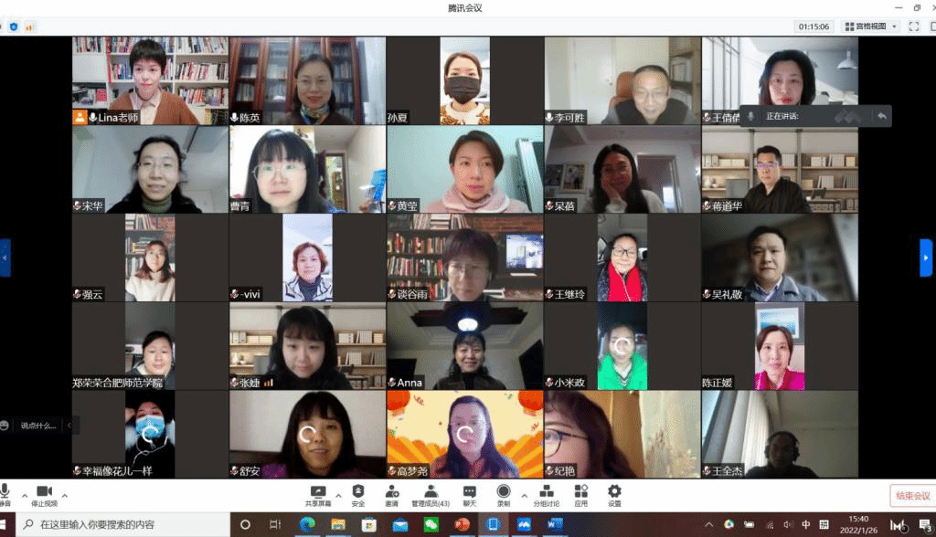 本网讯 2022年1月26日下午,公司召开了英语(师范)专业认证工作第二阶段部署会议,会议通过腾讯会议软件线上进行。副经理李可胜和英语(师范)专业认证工作组负责人、组长、认证分工工作组全体教师、英语(师范)专业课程的所有相关任课教师参加了本次会议,会议由英语系副主任钱莉娜老师主持。