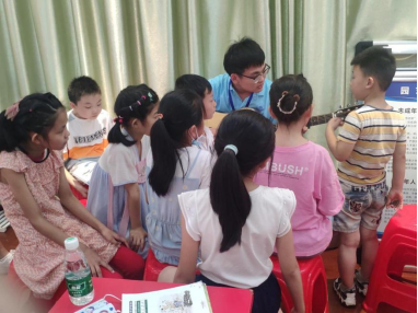 除此之外,园艺场社区行知学堂也注重调动小学员们的参与性和互动性,除了开展各类丰富多彩的趣味游戏外,小先生们也会用吉他伴奏教小学员唱歌,并与小学员们一起合唱,大家纷纷围坐在小先生身旁,认真学习,现场气氛轻松活跃。
