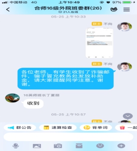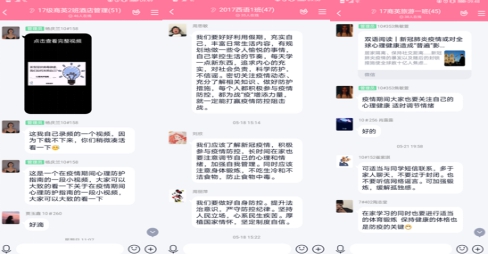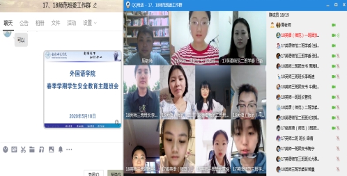 2017级商务英语专业,于5月21日,通过线上座谈会开展春季安全教育主题班会,辅导员苏珊在会议上强调了要加强学习习近平新时代中国特色社会主义思想和社会主义核心价值观,坚定“四个自信”,解读宗教政策,反对非法宗教。另外,心理委员从心理健康的角度通过班级QQ群上传疫情期间心理防护指南的视频,提醒员工疫情在家期间要注意调节自己的心理与情绪,加强自我管理,同学们纷纷学习并开展讨论分享自己在家调节心情的方式方法。生活委员就卫生安全和饮食安全,向同学们提了一些建议和方法,提醒大家要养成良好的卫生习惯,注意个人卫生。安全委员提醒同学们谨防电信诈骗,远离“网贷”,树立正确的消费观与价值观,也提醒同学们找工作、做兼职中也要识别就业陷阱,谨防传销。