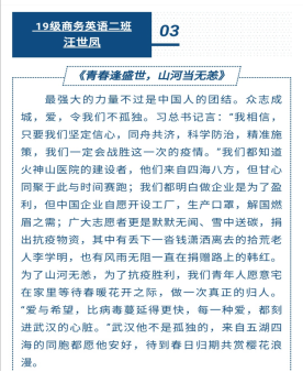 其中,朱宇同学写道“这场战疫中,我们从全方位的极限压力测试中看到了集中力量办大事的中国制度优势,看到了中国共产党以人民为中心、将人民群众生命安全和身体健康放在第一位的价值情怀。”字里行间流露出对中国共产党的爱戴,对国家制度的认同。汪世凤同学写道:“他们在“以人为本”这条路上一直不忘初心、牢记使命。甚至有一种来自心底的感觉:中国在,我就安心;在中国,就是幸福。”深刻表达了我们对党和国家的信任。同时关于奔赴在前线的英雄们代雅青同学写道:“在公与私的天平上,你们毅然选择坚守防控一线。这就是一名普通基层医护人员,用自己的行动诠释初心与使命,用自己的付出彰显责任与担当。”体现出对前线医护人员的赞美与敬佩。无论从哪个方面来看,同学们的一字一句都流露出对国家的热爱,对民族的自信,对党的敬意。当然,优秀的稿件还有许多,从中我们也可以体会到他们对于习近平总书记关于疫情防控工作的系列讲话的学习,可以感受到我国青年始终与国家同呼吸、与民族共命运,并正在抗疫的途中绽放出属于青年学子们的绚丽青春。
