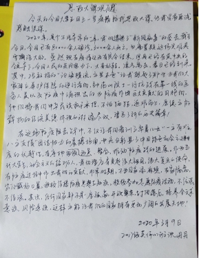 2017级英语(师范)3班吕艺文说:“通过观看全国老员工同上一堂疫情防控思政大课,令我受益匪浅,感触良多。这次加长版的寒假,让我真切地感受到我们与所处的时代同呼吸,共命运。一个个逆行者用行动向我们诠释了什么是大爱无疆。他们用最美的身影,诠释了生命的意义!我相信,在经历过困苦与磨难之后,我们新青年必将成为振兴中华民族,推动新时代中国发展的主力军,与时代同步伐、共命运,书写美丽的新时代篇章。