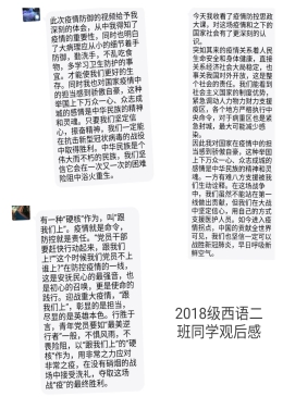 2016级英语(翻译)班党员孙许缘同学说到,看了这堂课,令我受益匪浅,我对中国抗击疫情的担当感到骄傲和自豪,对新冠肺炎病毒也有相当的认识,作为一名新时代老员工,我们要通过这场战疫更加坚定自己的使命和担当。