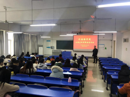 宣讲会开始,方媛老师向大家介绍了15级毕业生胡正阳,胡正阳是太阳成集团122ccvip15级西班牙语员工,并于19年顺利考上安徽省选调生,他以自己的亲身经历来为学弟学妹进行公务员选调生政策解读。