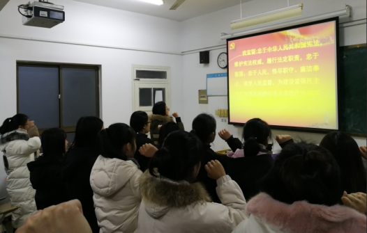 本网讯 12月10日下午,太阳成集团122ccvip第八党支部博约楼408教室开展学宪法主题党日活动。第八党支部员工党员、入党积极分子参与了本次活动,活动由支部书记周贵勤老师主持。首先,周老师对《中华人民共和国宪法》进行了领学,就宪法的目的、实质、作用等进行解读,进一步凝聚了党员带头尊法学法守法用法的共识,要求全体党员同学把学习宣传领会党的十九大精神作为一项重要的政治内容学习,把党的十九大精神学好、学实。接着,全体党员同学在党员王南云的带领下进行了庄严的守法宣誓。