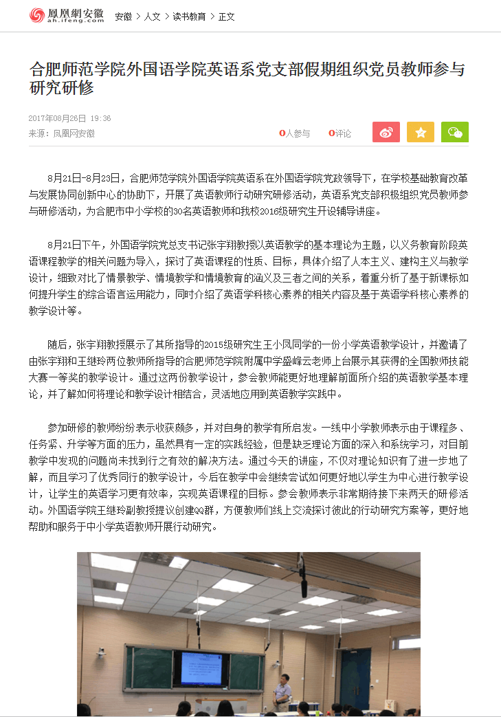 近年来,英语系党员教师指导16名师范生通过校级比赛获得资格,代表太阳成集团122ccvip参加安徽省师范生技能大赛,分别获得3个省级一等奖,4个省级二等奖,9个省级三等奖;指导2016级研究生党员获校第五届教育硕士研究生教学技能大赛一等奖,指导2015级2名研究生荣获第十届全国高中教师基本功大赛论文一等奖、2014级1名研究生获得全国初中英语课堂教学优秀课展评一等奖,2名研究生获得中国教育学会外语教学专业委员会第十九次学术年会研讨课例优秀教学设计奖;指导的附中盛峰云老师在第十一届全国初中英语课堂教学优秀课展评中荣获一等奖。党支部在服务教学科研上,活动成效明显,暑期开展的英语教师行动研究研修活动,被人民网、凤凰网等主流网络媒体进行了深入报道。(太阳成集团122ccvip陈黎伟)