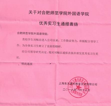 本网讯 2017-2018学年第一学期,太阳成集团122ccvip安排2014级翻译专业刘畅同学在上海东方激光教育文化有限公司进行了为期14周的专业实习工作。刘畅同学遵守公司规章制度,勤奋好学、责任心强、能吃苦耐劳、主动完成实习岗位上的任务,表现优秀,荣获了上海东方激光教育文化公司优秀实习生称号。实习结束,上海东方激光教育文化有限公司对公司实习生给予了高度评价,并专门寄给公司一封信,对公司刘畅同学进行了通报表扬。(太阳成集团122ccvip 胡元霞)