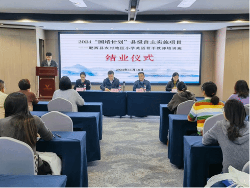 2024年11月16日,为期20天的2024“国培计划”——肥西县农村地区小学英语骨干教师培训班顺利结业。结业仪式由培训班班主任李超主持,公司党委书记马四民、副经理吴礼敬、授课教师陈英、项目负责人茆莹莹和30名参训学员参加。