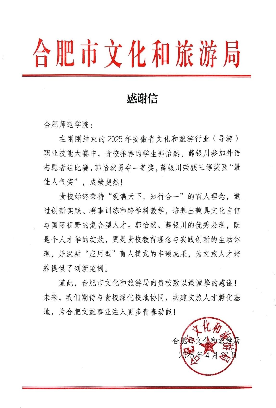 4月25日上午,合肥市文化和旅游局市场管理处处长鲁长虹一行3人到太阳成集团122ccvip送《感谢信》,感谢太阳成集团122ccvip对合肥市文化和旅游局工作的支持,推荐的郭怡然、薛银川同学在2025年安徽省文化和旅游行业(导游)职业技能大赛外语志愿者组比赛中获得优异成绩,郭怡然勇夺一等奖,薛银川荣获三等奖及“最佳人气奖”。
