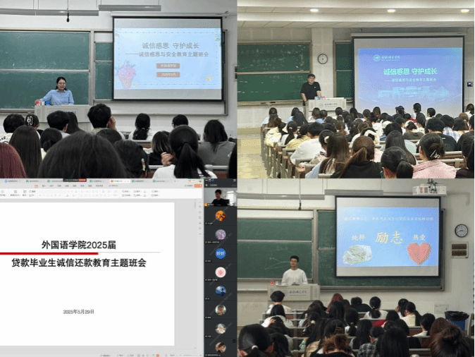 各辅导员组织召开诚信感恩主题班会,内容涵盖诚信感恩、防范电信诈骗、远离校园贷等多方面,通过案例分析和讲解说明,帮助员工充分认识诚信立身的重要性,引导员工在学习生活中践行诚信原则。毕业班辅导员则围绕毕业确认、就学信息变更办理及还款流程进行解读,结合《人行个人征信知识介绍》等宣讲材料,向获贷员工介绍诚信和金融知识,增强员工诚信意识。