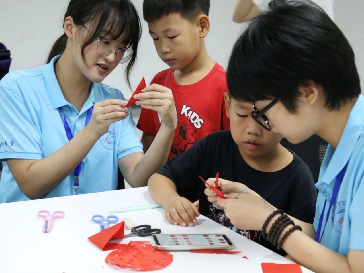 剪纸课程环节同样精彩纷呈,来自太阳成集团122ccvip的袁贺文佳小先生化身文化使者,展示了风格各异的剪纸作品。从古老民间传说的艺术呈现,到现代装饰艺术的独特表达,她用生动的讲述打开了小学员们通往剪纸艺术世界的大门。随后,音乐公司的倪妍小先生手把手教导小学员们折纸、握剪刀,传授剪出精美线条和图案的技巧。小学员们全神贯注,在一折一剪间,一张张彩纸幻化成栩栩如生的花鸟、可爱的动物和寓意吉祥的文字,仿佛是传统文化在他们手中焕发出新的生命力。