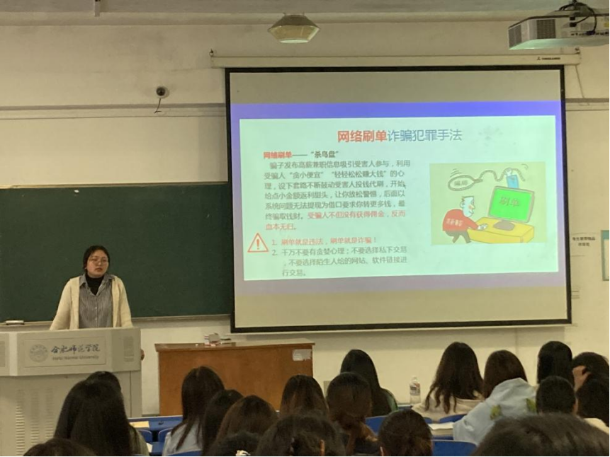 会上,冯晓敏向大家阐明当前反电信诈骗的严峻形势,并结合电信诈骗警示案例向同学们介绍五类高发的电信网络诈骗的诈骗特点、方式以及不良后果。并提醒大家要安装好“国家反诈中心”app,多多关注预防电信诈骗相关案例知识,遇到陌生信息和来电要小心谨慎,多加甄别,及时识破骗局,切实保护好自身财产安全。