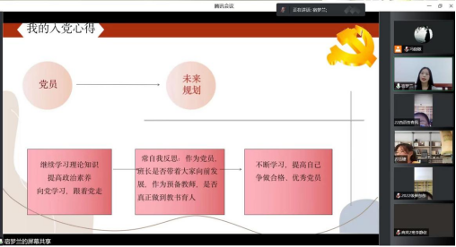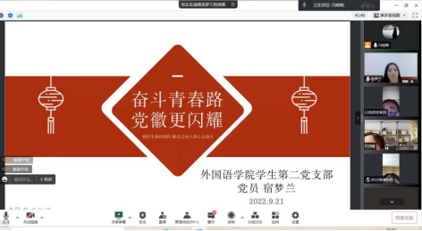 不仅如此,公司鼓励用身边人讲述身边事,积极发挥党员的先锋模范作用。21日晚,公司开展优秀党员事迹线上宣讲会,员工第二党支部党员宿梦兰结合自身实际经历,向新生分享自己在学习、生活方面的经验,讲述自己入党的初心和历程,并鼓励新生们积极递交入党申请书,在青春的征程上继续奋斗,开启人生新篇章。
